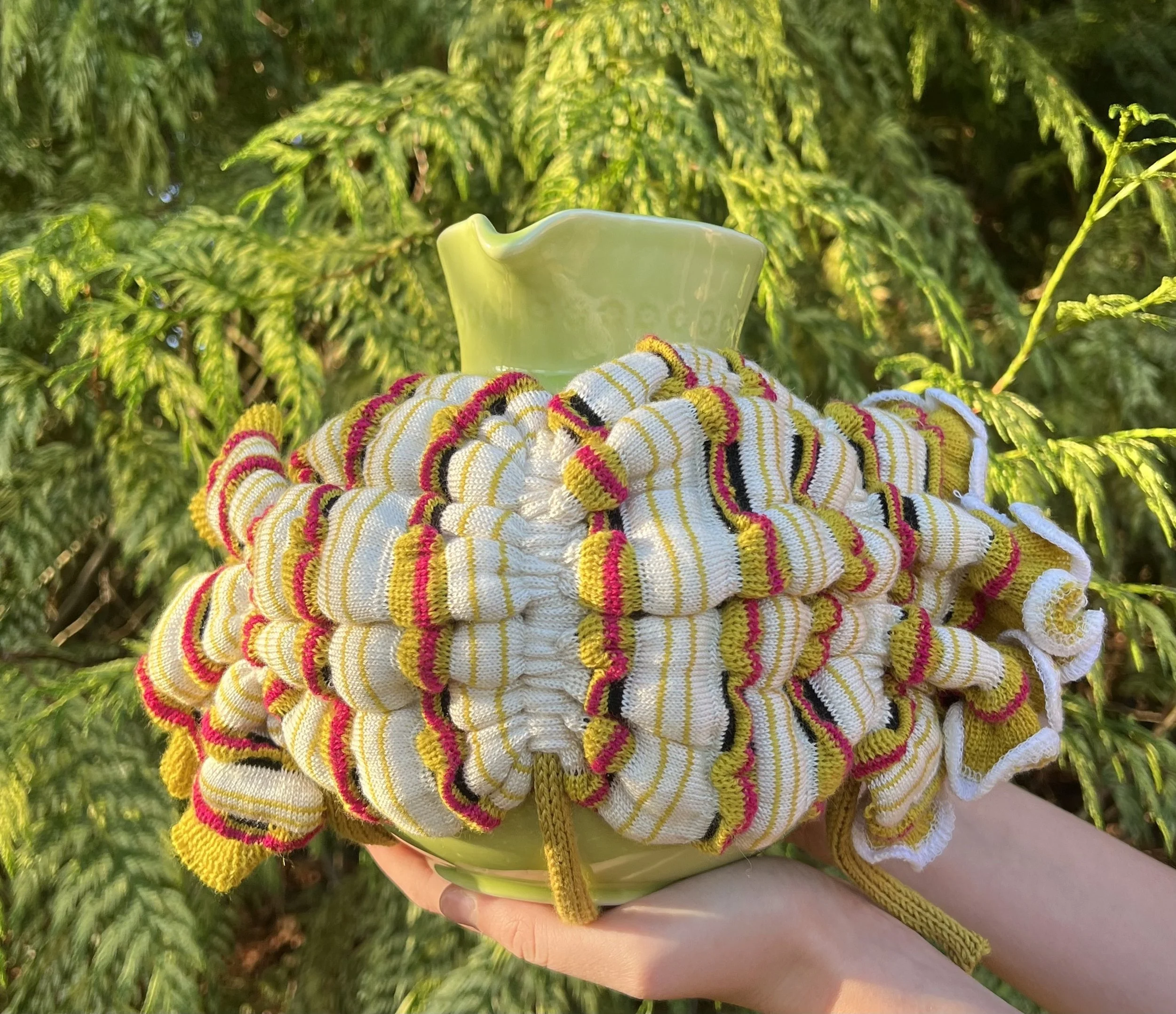 For this project my aim was to produce a range of 100% sustainable knitted samples, showcasing protective casings, using British yarns and fibres. For the designs and colours I looked at caterpillars' life cycles and their defensive behaviours.